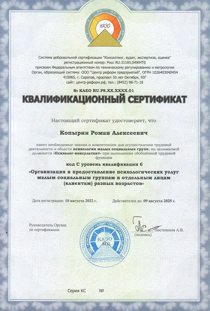 Диплом о профессиональной переподготовке установленного образца и квалификационный сертификат соответствия Профессиональным стандартам.